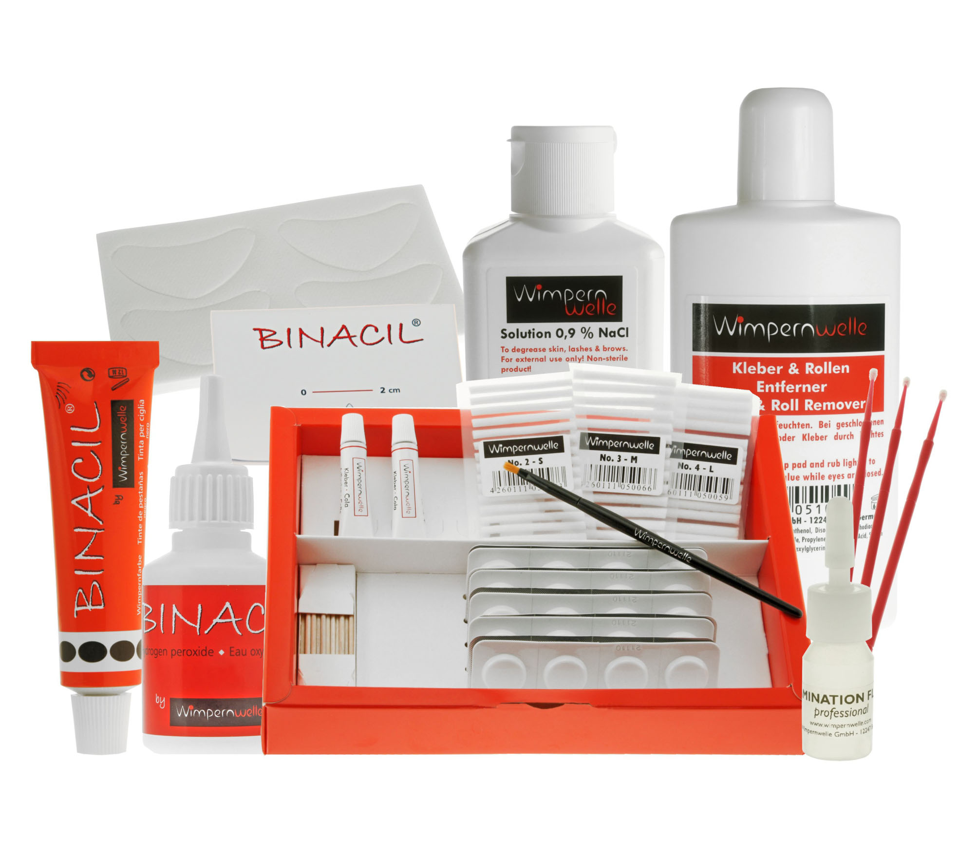 1 x set de bază lifting CLASIC monodoză, 1 x soluţie fiziologică salină, 1 x soluție pentru îndepărtat adezivul și bigudiurile, 1 x BINACIL® vopsea de gene negru-albăstrui, 1 x BINACIL® oxidant, 1 x BINACIL® bloc de amestec mic, 25 dischete de protecție, 1 x fluid pentru laminare profesional, 1 x Poster DIN A2, 20 de bucați pliant "Wimpernwelle lifting de gene CLASIC“