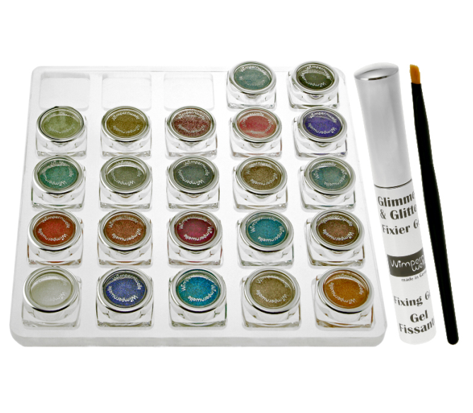 29 x cienie do powiek GLIMMER & GLITTER w 7 kolorach: 5 x śnieżna biel, 5 x platynowy, 5 x orzechowy, 4 x piaskowy, 3 x różany, 3 x czarny, 3 x srebrny
