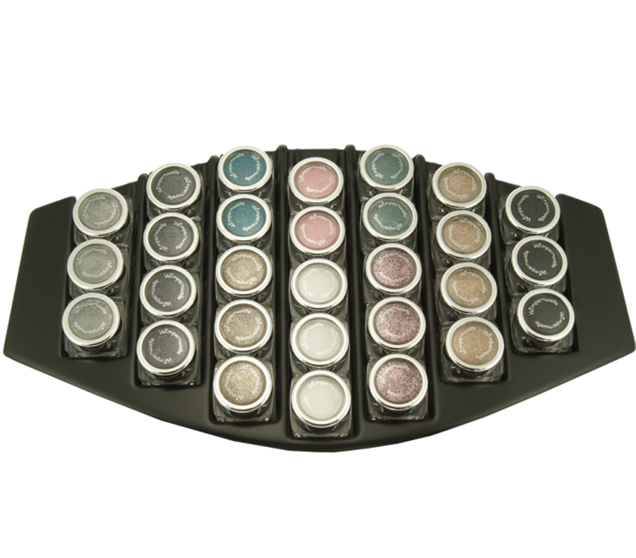 29 x cienie do powiek GLIMMER & GLITTER w 10 kolorach: 4 x platynowy, 4 x orzechowy 3 x śnieżna biel, 3 x piaskowy, 3 x różany, 3 x czarny, 3 x srebrny, 2 x ciemny zielony, 2 x koralowy, 2 x turkusowy